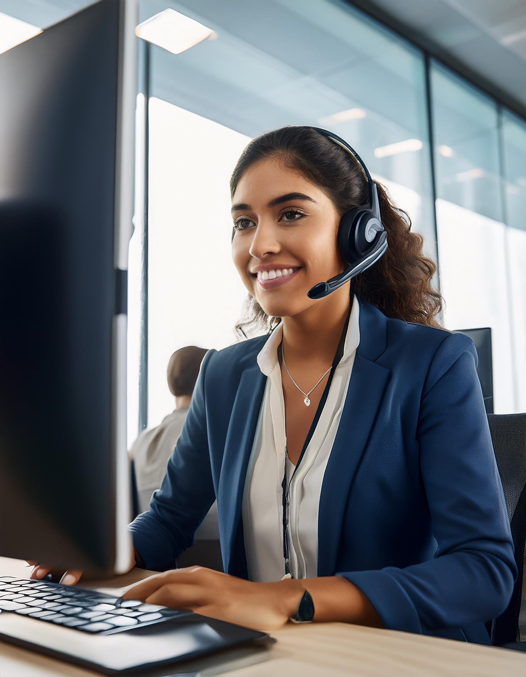 Firefly Mujer detrás de un escritorio de recepción de una oficina elegante y tecnológica. 46520